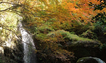 秋には、落差約15mを誇る白藤滝を中心に滝山渓谷一帯が紅葉で彩られます。